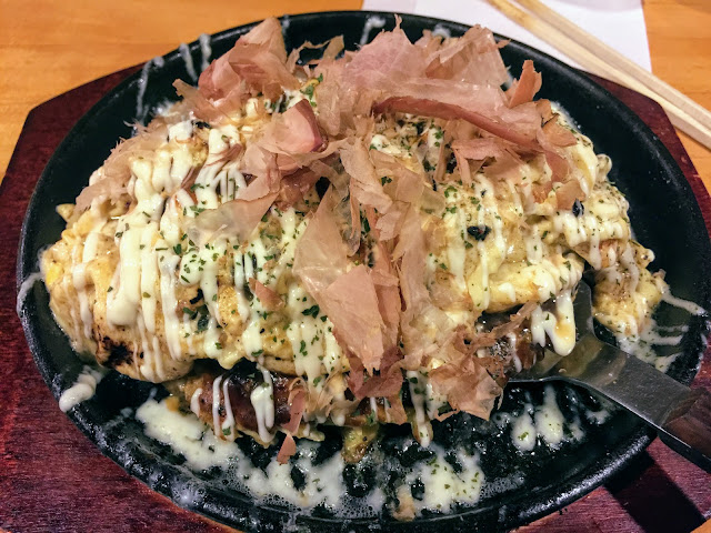 關西風的お好み焼き,關西風與広島風最大的差別在於料理的方式,關西風將蔬菜和其他食材與麵粉一起混合煎。而広島風則是把麵粉煎成像薄餅,其他食材在煎炒完後用堆疊的方式呈現